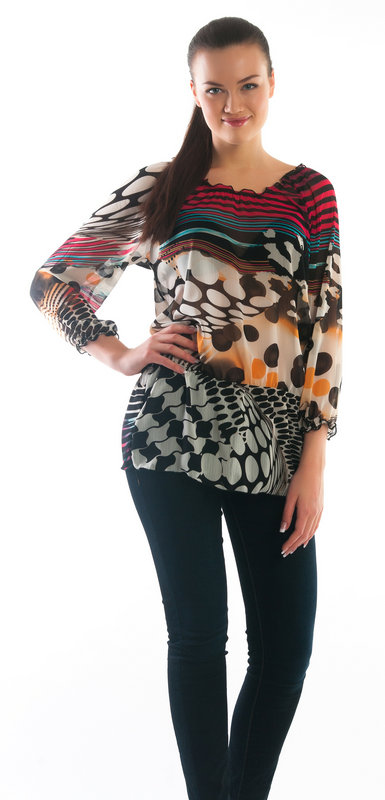 Универсальная туника подойдет к любому типу фигуры.Шифон с содержанием вискозы придает силуэту легкость и выглядит нарядно. Еврошифон 35% вискозы,60% п\э,5% элластан.